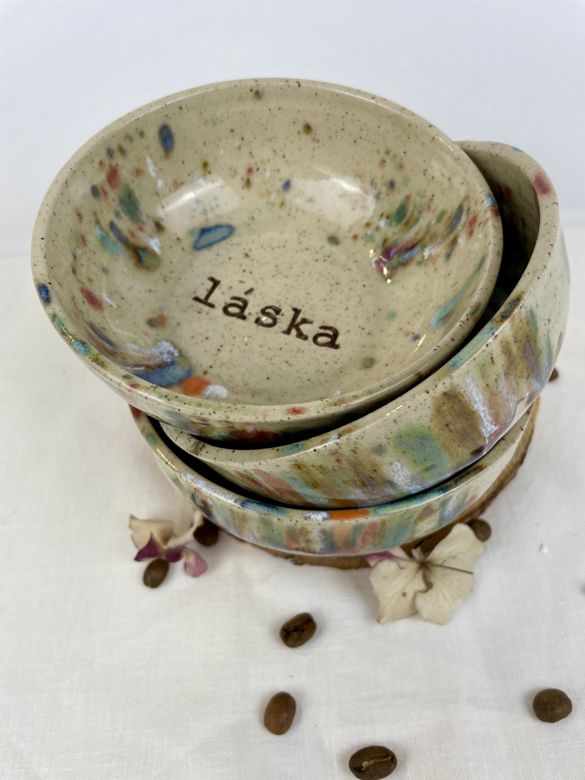 Točená miska ze světlé kameniny s nápisem láska na dně.