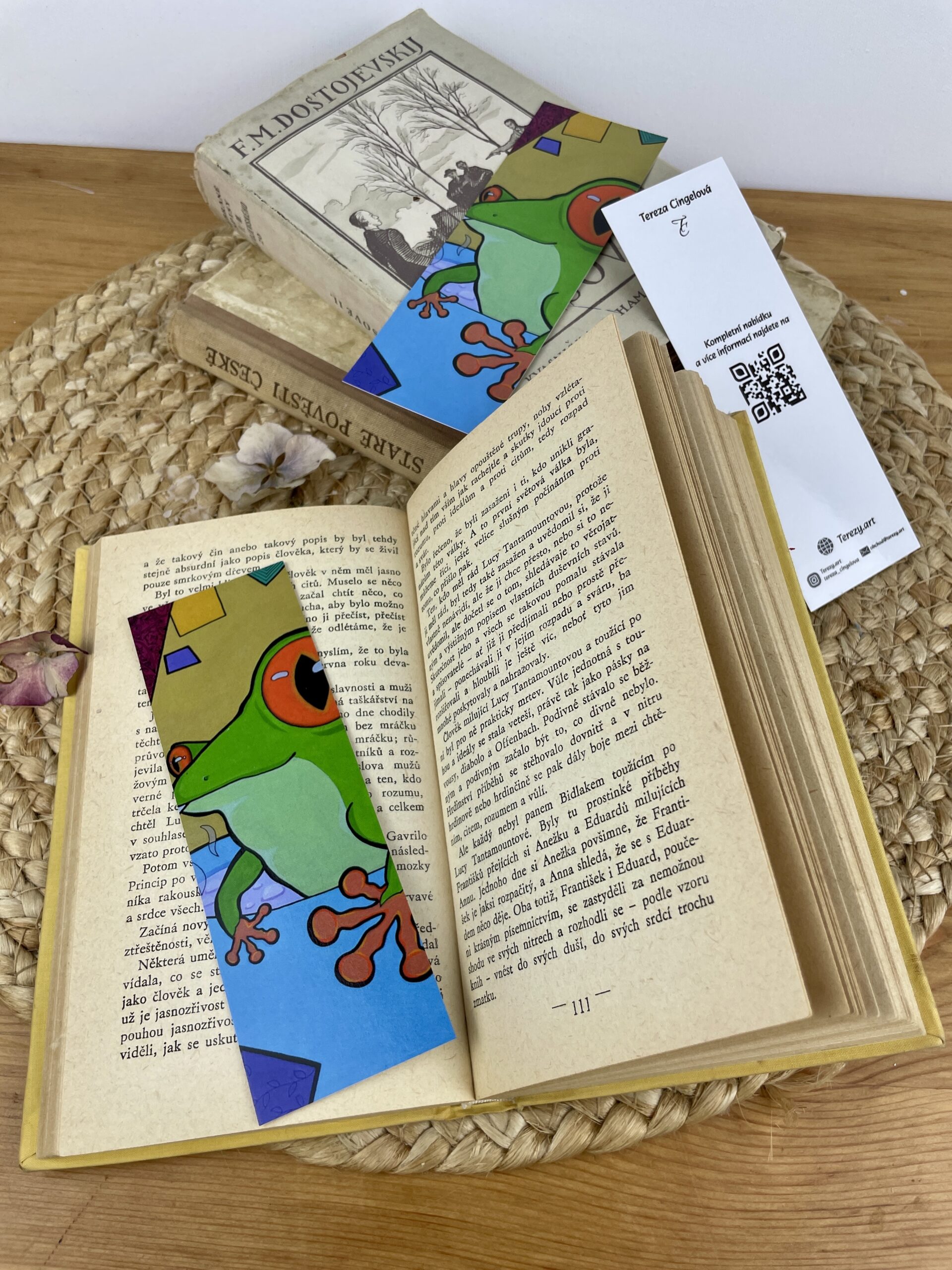 Kvalitní laminovaná záložka s výřezem obrazu žabí syndrom.